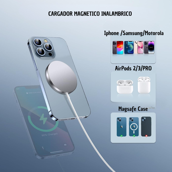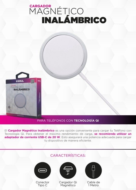 El Cargador Magnético inalámbrico es una opción conveniente para cargar tu teléfono con tecnología Qi. Para obtener el máximo rendimiento de carga, se recomienda utilizar un adaptador de corriente usb-c de 20W. Esto asegurará un potencia adecuada para cargar tu dispositivo de manera eficiente.